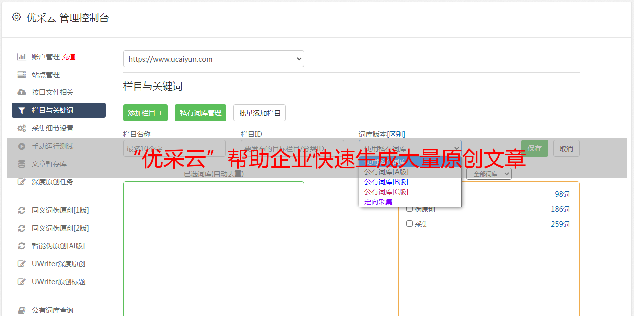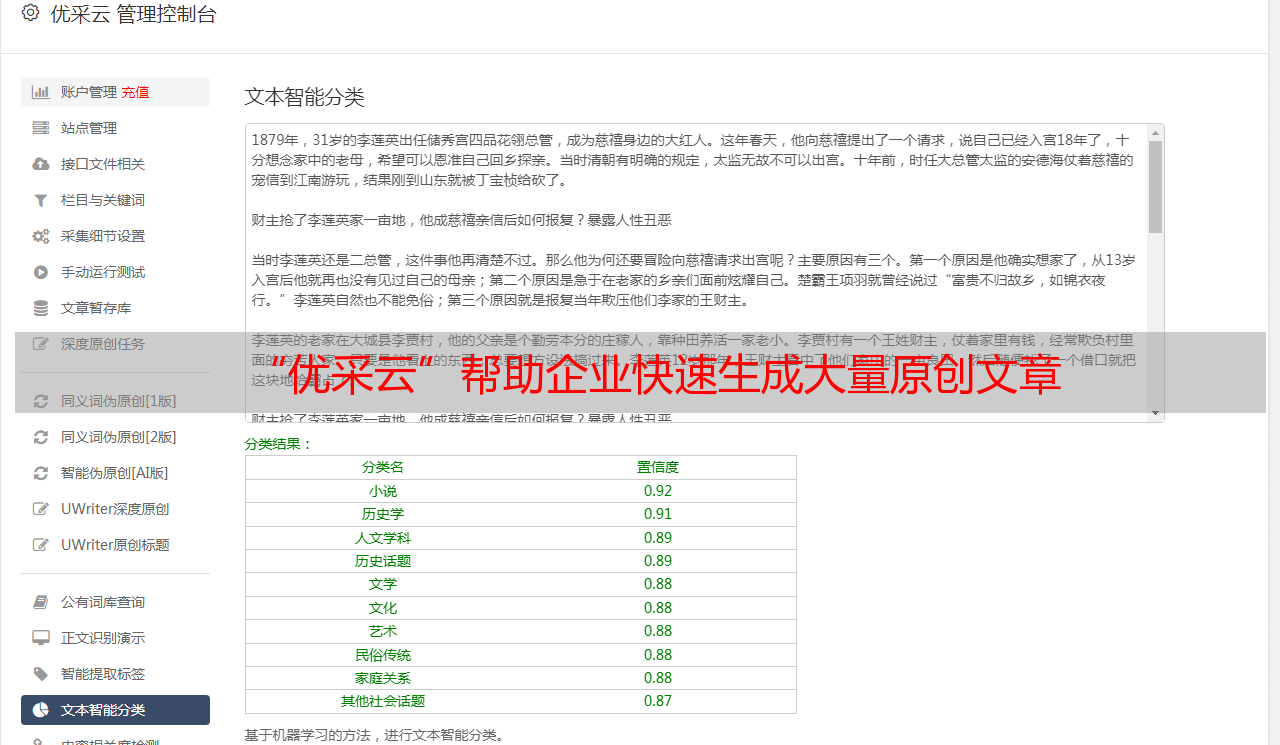 总之,使用“优采云”不仅能够快速生成大量原创内容,而且还能帮助用户将其应用于不同场合中。凭借其快速、便捷和SEO优化功能,“优采云”已经得到了国内许多大型企业和机构的认可。想要尝试使用“优采云”(官网www.ucaiyun.com )的人可以前往它的官方网站进行注册使用!