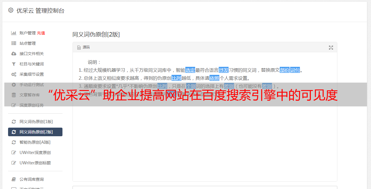 “优采云”能够帮助用户快速、准确地实施百度伪原创,使用者无需学习复杂的SEO理论和技术就能够实施此项工作。此外,该软件还能够有效避免重复内容、生成相关性强、逻辑性好、语义衔接流畅的文章内容,有效促进文章内容的品牌化、准确性和真实性。