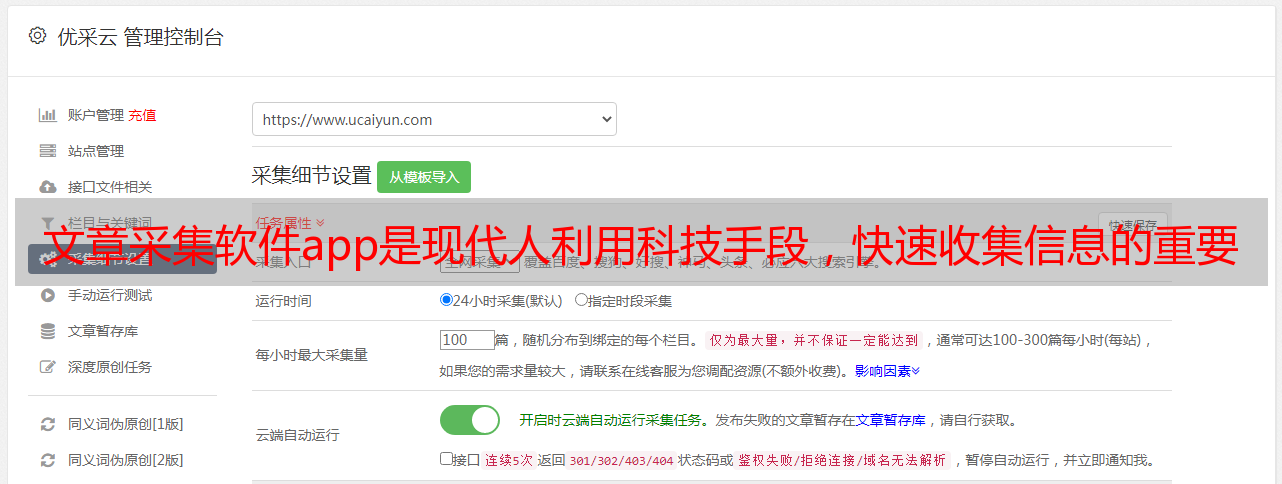 总之,优采云是一款强大的文章采集软件app。它不但具备丰富的功能,还有专业的服务团队和安全性能强大的数据分析系统。如果你想快速准确地获取各类文章信息,就不要错过优采云啦!快去www.ucaiyun.com 看看吧!