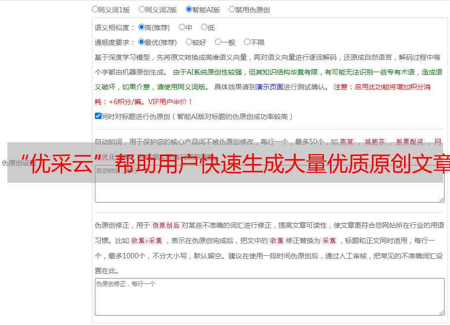 “优采云”通过使用高度可定制的SEO优化功能来帮助用户快速生成大量原创文章。此外,该软件还具备数十种内容补充功能,可以帮助用户在写作过程中准确补充关键字、图片、图表和表格等内容。这些内容将有效地将用户的文章从一般性文章中区分开来,使之受到读者和搜索引擎的青睐。
