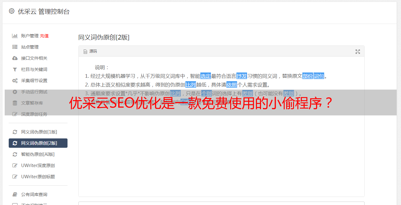 优采云SEO优化是一款由国内顶尖的SEO技术专家开发的小偷程序,旨在帮助用户快速准确地完成伪原创任务。它具有以下特性: