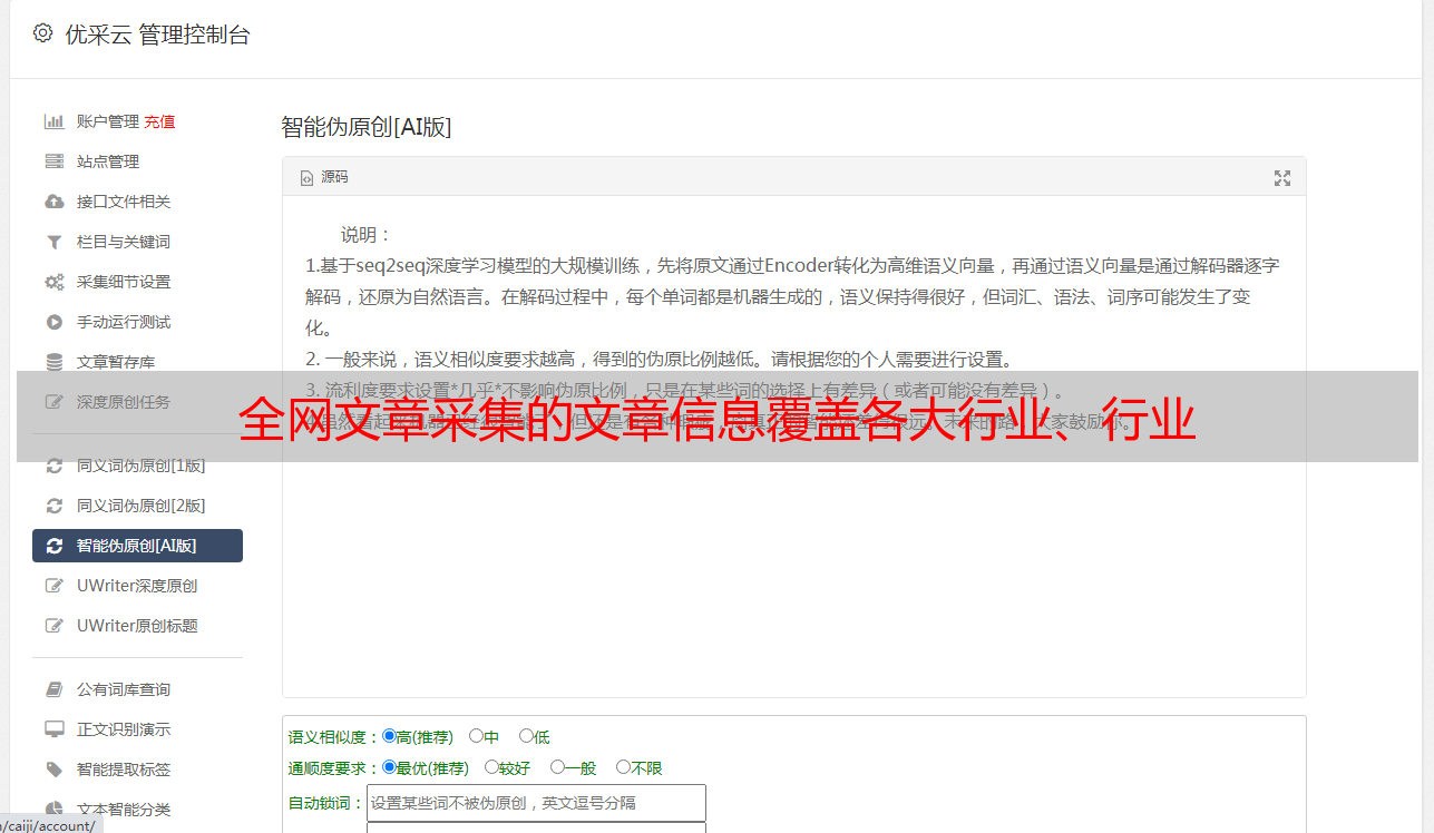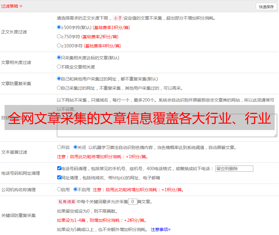 优采云采集的文章信息覆盖各大行业、各个国家,包含新闻、博客、微博、论坛、问答等信息,可以根据企业自身情况进行定制化的采集,并且能够根据用户的需要快速将所得内容进行整理分类。此外,优采云还具备专业的SEO优化能力,能够帮助企业高效地将内容发布到各大搜索引擎中去,使之能够被公众及时发现。