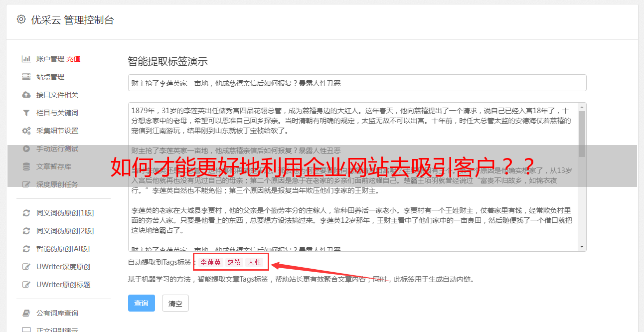 优采云 发布时间: 2023-01-14 00:28随着互联网的发展,企业网站的建设也变得越来越重要。一个优质的企业网站不仅能够帮助企业拓展新的市场,还能够构建良好的企业形象,提升品牌影响力,吸引更多的客户。但是,如何才能更好地利用企业网站去吸引客户?