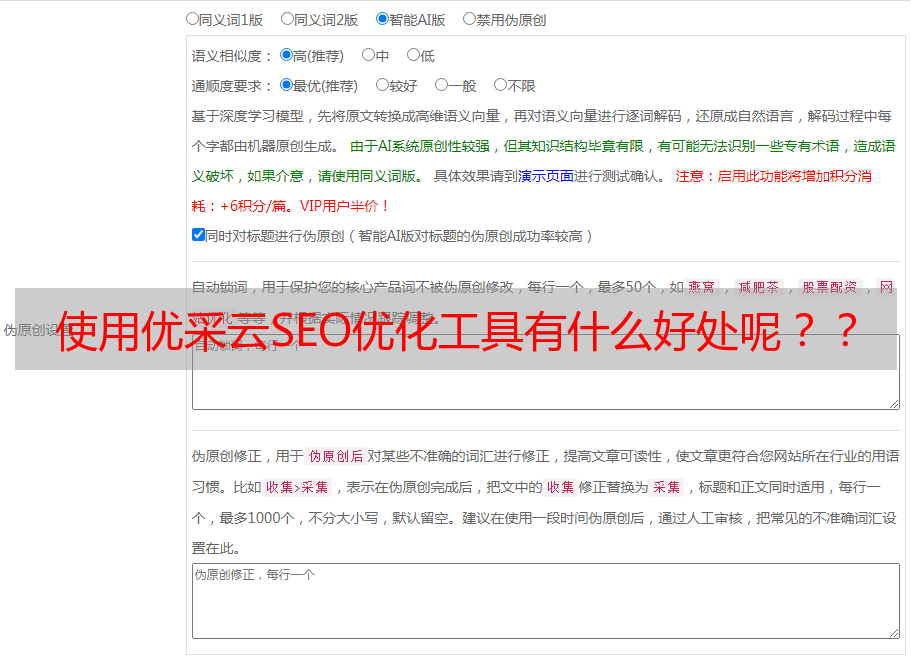 总之,优采云SEO优化工具是一个很好的帮助用户进行伪原创编辑的工具。它能够根据用户需要快速、准确地生成一篇独特、高质量的文章,并且能够有效地避免重复内容对SEO的不利影响。如果你想快速、有效地进行SEO优化,那么使用优采云SEO优化工具将是一个不错的选择。它能够帮助你快速、有效地生产出高质量、独特的文章内容,并且不会引起重复内容对SEO的不利影响。如果你想了解更多详情,可以前往官网www.ucaiyun.com 进行浏览了解。