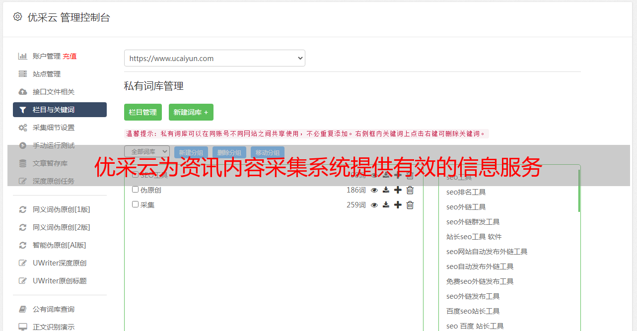 优采云是一款功能强大的资讯内容采集系统,它能够从各大门户网站、新闻媒体、博客以及图片、音频、视频等多个来源中快速、准确地采集有价值的信息,并将这些信息存储到服务器上,从而使用户可以随时随地获取所需信息。此外,优采云还具有SEO优化功能,能够根据用户的要求对所采集到的信息进行优化,以便在各大门户站中得到最佳展示。