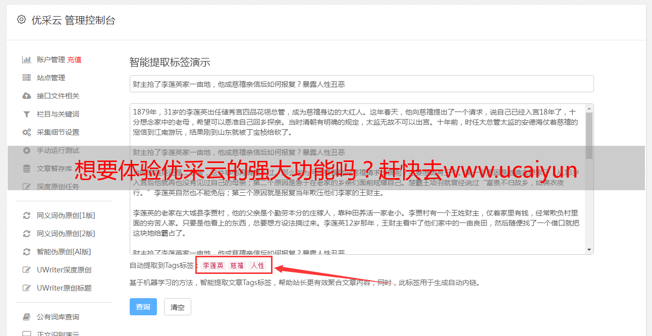 总之,优采云是一款强大的SEO优化工具,不仅免费而且功能强大。它既能够快速地生成文章内容,又能够帮助用户分析相关信息。如何使用优采云呢?首先要注冊账号并登录。然后根据输入的信息进行相应的设置即可使用。想要体验优采云的强大功能吗?赶快去 www.ucaiyun.com 注冊吧!