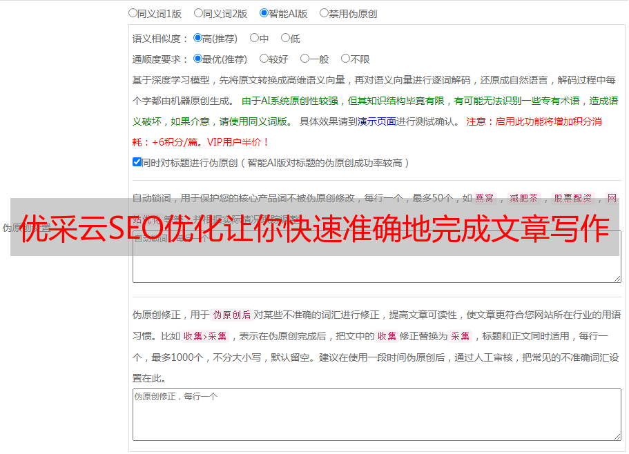总之,伪原创在线工具是一个非常实用而又十分便捷的工具。如果你想要快速准确地完成文章写作并提升SEO优化水平,不妨试试使用优采云SEO优化这一强大而便捷的工具吧!你也可以前往它官网www.ucaiyun.com 了解相关信息。