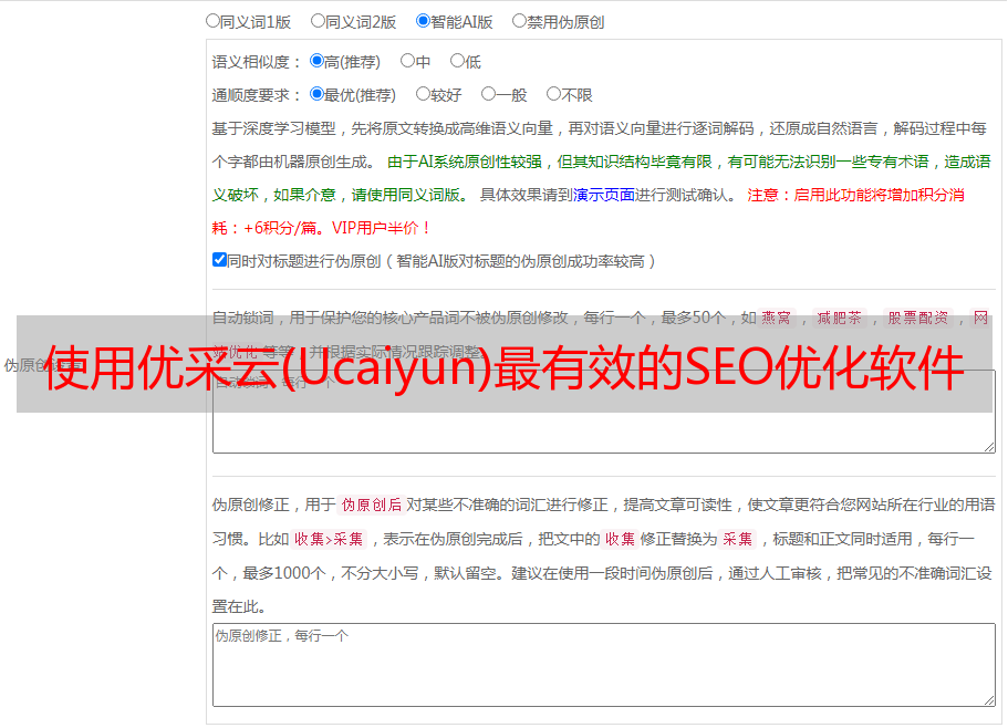 总之,使用SEO优化软件是避免伪原创的最佳方法之一。尤其是使用优采云(Ucaiyun)这样的SEO优化软件更是如此。它可以帮助用户快速生成原创文章、评论、标签、图片、视频等多种形式的内容,并提供多种SEO工具来帮助用户对内容进行专业的分析和评估(官网: www.ucaiyun.com )。