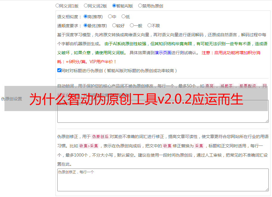 此外,对于一些SEO优化方面的工作,智动伪原创工具v2.0.2也能够帮助用户做到。它可以帮助用户快速生成各种SEO优化所需要的信息,例如关键词、标题、Meta标签、图片alt标签等。这样一来,用户就可以快速有效地进行SEO优化工作,帮助网站打开搜索引擎的大门,使之在搜索引擎中得到正确的识别和对待。