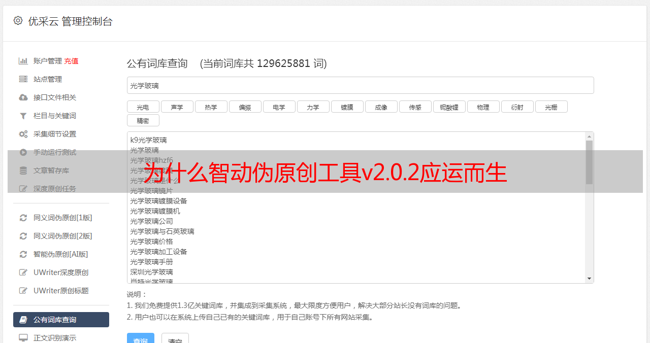 优采云 发布时间: 2023-01-15 01:37如今,互联网上的信息量越来越大,内容的创作变得越来越重要。但是你会发现,有时候想要准确而且有效地表达一个话题却很难。这就是为什么智动伪原创工具v2.0.2应运而生了。