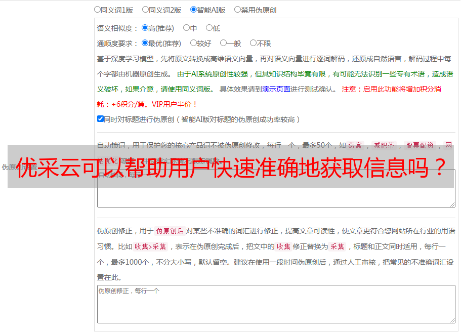 优采云不仅可以帮助用户快速准确地获取信息,还可以帮助用户进行SEO优化,使用户的文章出现在搜索引擎前列。此外,该软件还具有高效、易用、安全、可靠等特性。为了方便用户使用,优采云还提供了PC版和APP版两个版本供用户使用。