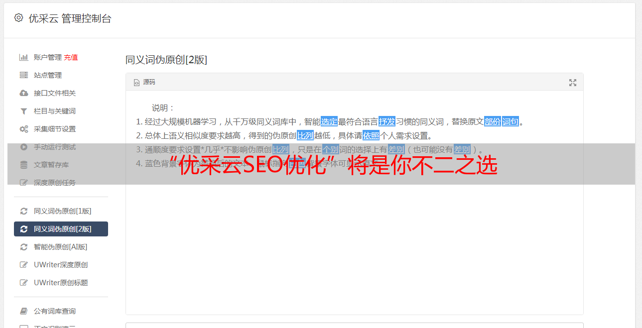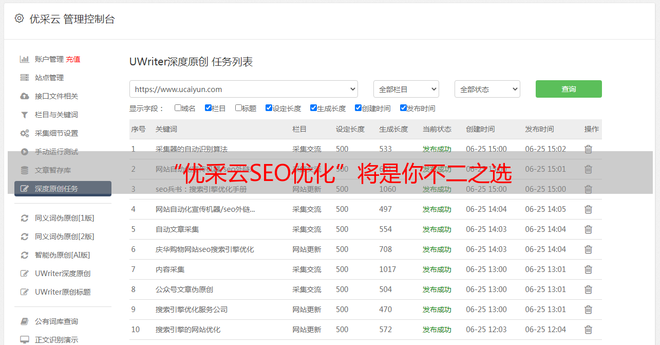 当然,尽管如此,使用者也应该根据自己的要求来选择合适的伪原创工具。如果你想要快速、高效地生成大量语料来增加内容优化和SEO效果,“优采云SEO 优化”将是你不二之选。它是一个功能强大、易于使用、安全可靠、效果显著的伪原创工具,它将帮助你节省时间并提升效率。如果你想要使用“优采云SEO 优化”,请访问它的官方网站 www.ucaiyun.com 进行下载和注冊。