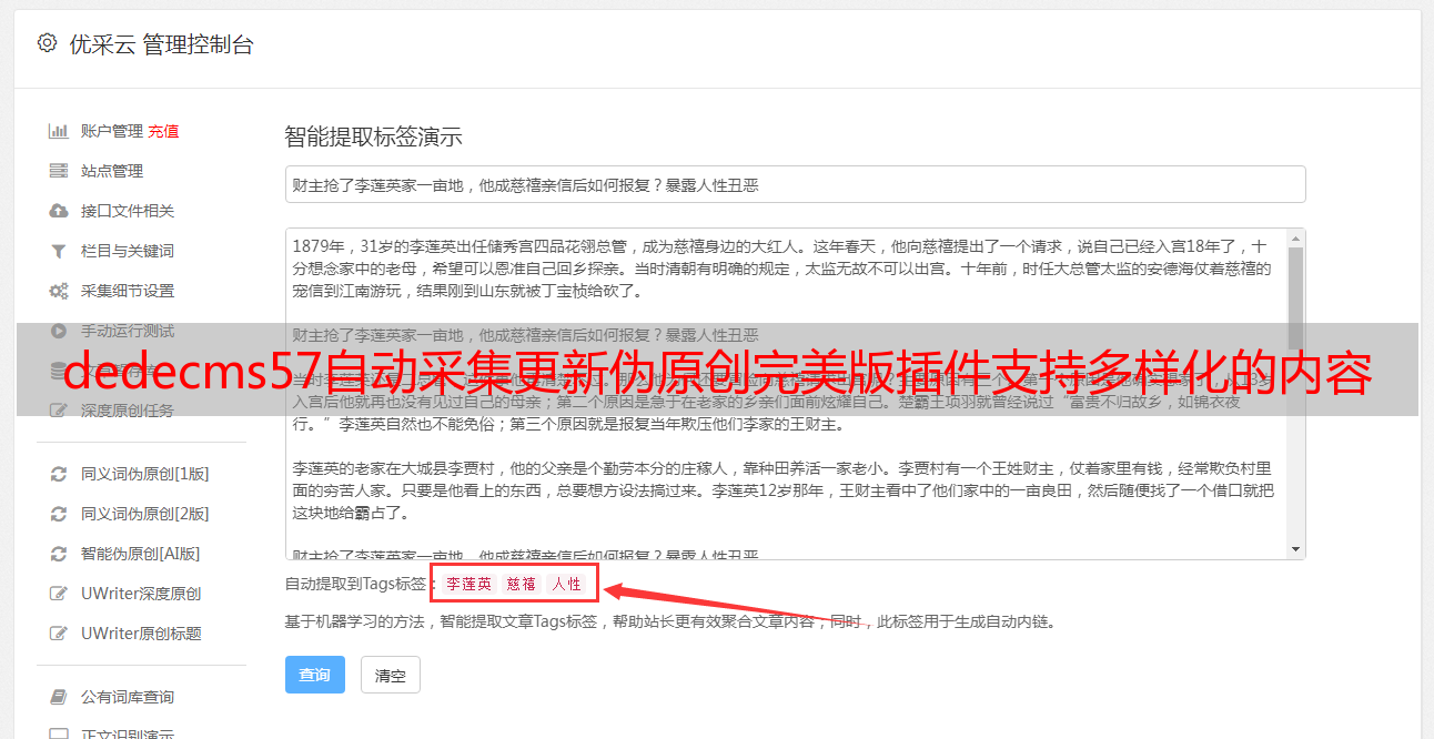 此外,dedecms57自动采集更新伪原创完美版插件还具有强大的SEO优化功能,可以有效地帮助用户在搜索引擎中获得合理的位置。该产品由优采云公司出品(www.ucaiyun.com),具有安全性高、使用便捷、性能卓越的特点。