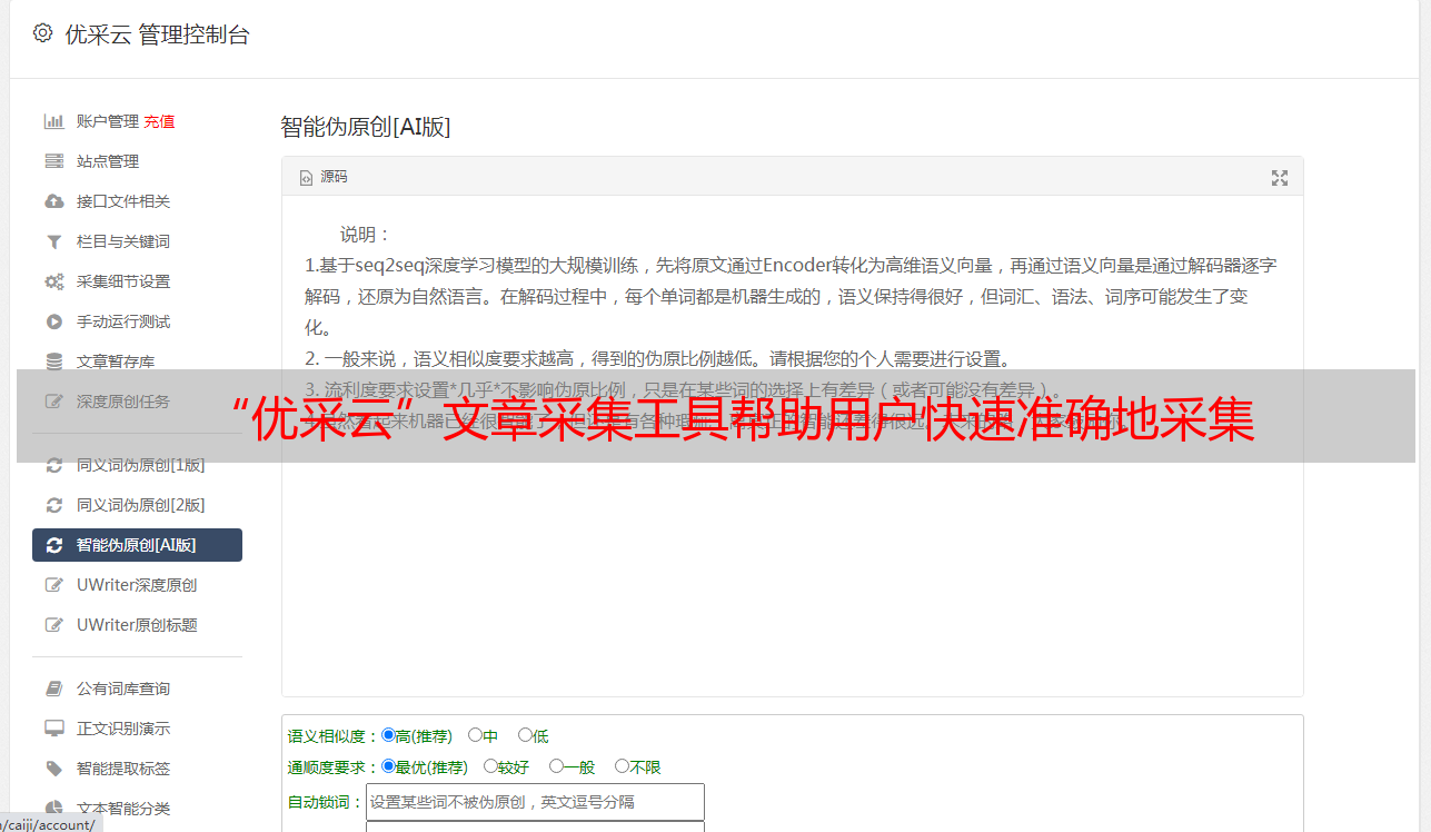 优采云是一款专业的网页文章采集工具,它可以帮助用户快速准确地采集各种新闻、博客、微博、论坛、图片、视频等信息,并将其存储到本地文件中。优采云不仅能够快速准确地采集所需要的信息,而且还能够根据用户的要求进行进一步处理,如去重、去广告、去垃圾信息、去噪声、整理格式、语义分析等。