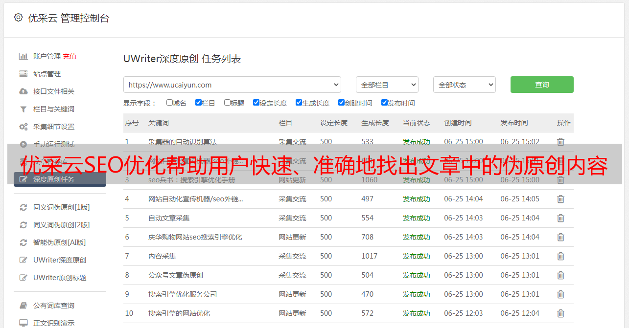 总之,优采云SEO优化是一款强大而专业的伪原创检测工具,它可以帮助用户快速、准确地找出文章中存在的各种形式的伪原创内容和重复性内容,有效防止作者版权遭受侵犯。如果你想要尽快找到伪原创内容并将其修正成正确版本,那么就不要错过了使用优采云SEO优化这一强大而专业的工具。你可以前往官网www.ucaiyun.com 下载使用试试看。