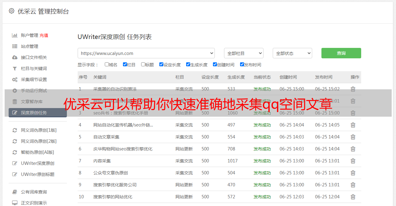 优采云是一款专业的qq空间文章采集软件,它提供了多样化的功能来帮助你快速准确地采集qq空间文章。优采云不仅可以帮助你快速准确地采集qq空间文章,而且还可以帮助你进行SEO优化,使你的文章在搜索引擎中显得更加优先。此外,优采云还可以帮助你将采集到的文章保存到本地。
