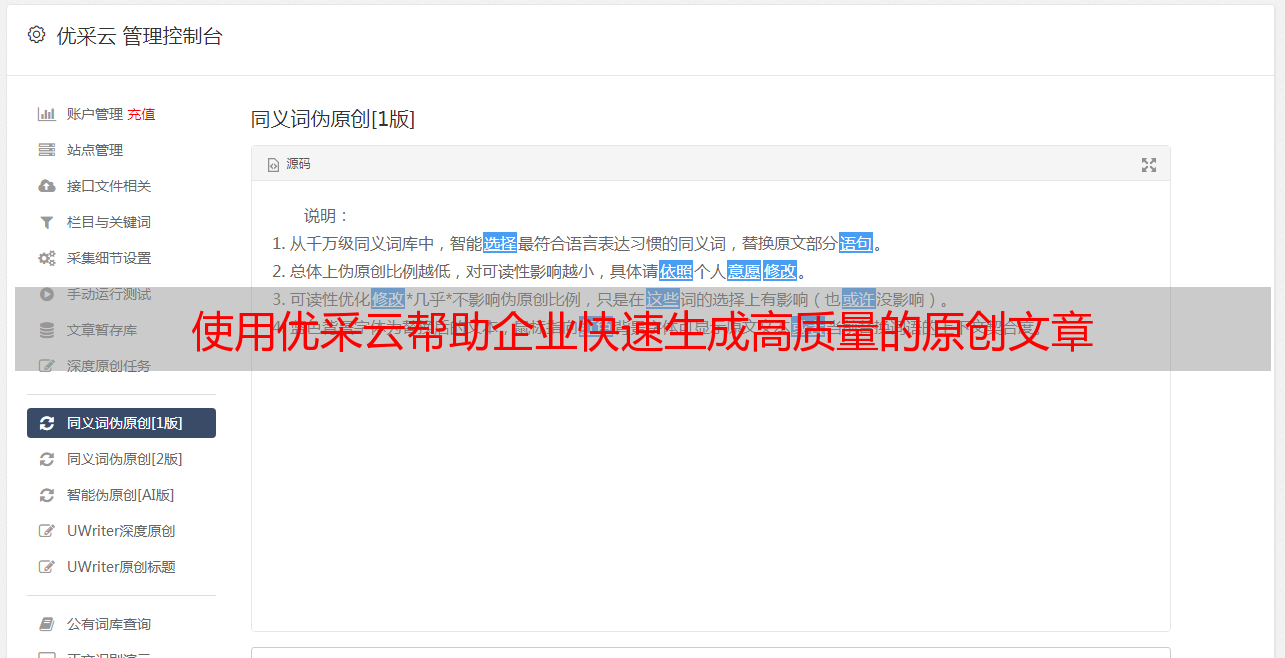 优采云是一款功能强大的英文伪原创工具,可以帮助企业快速生成高质量的原创文章,大大提升文章撰写效率。它不仅可以实现语义伪原创,而且还具有SEO优化功能,能够在保证内容原创性的前提下,有效地帮助企业将文章的SEO排名最大化。