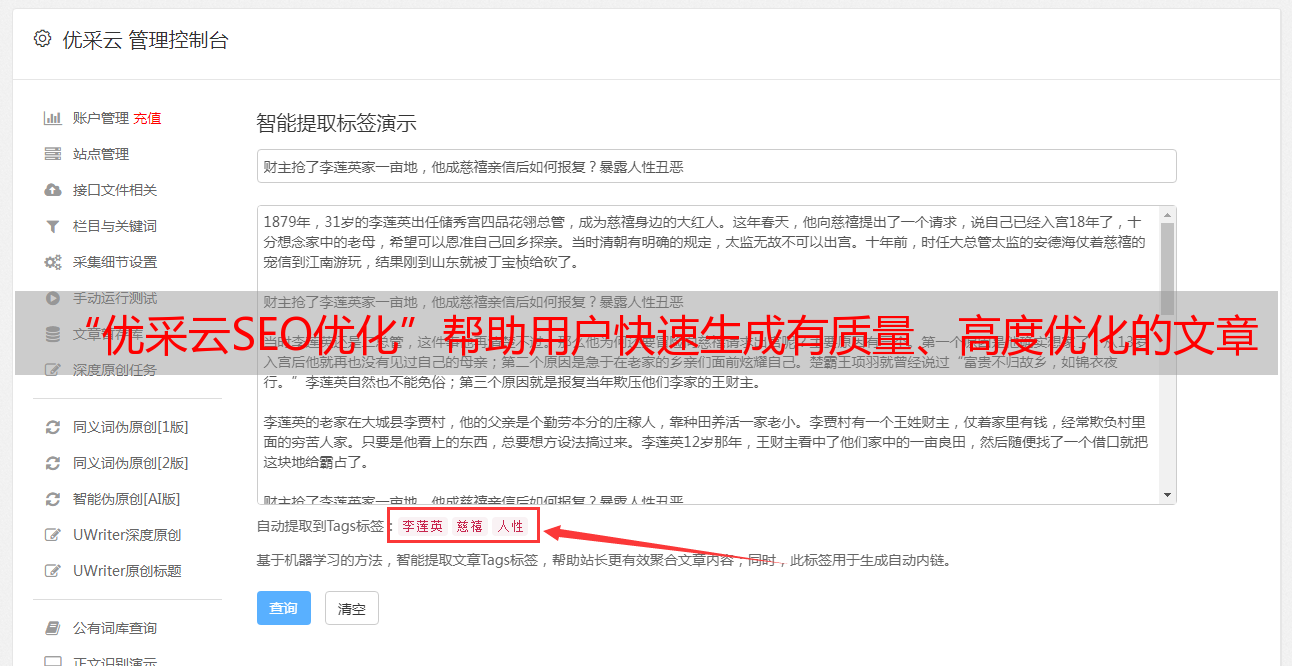 “优采云SEO优化”帮助用户快速生成有质量、高度优化的文章