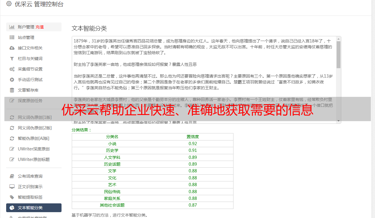 总之,使用优采云能够帮助企业快速、准确地获取所需信息;能够帮助企业进行SEO 优化;能够快速生成各类内容并推向各大媒体平台;能够有效地将信息快速、准确地传递给相关人士。想要了解详情或者尝试使用此服务的话,请上www.ucaiyun.com 浏览官方信息。
