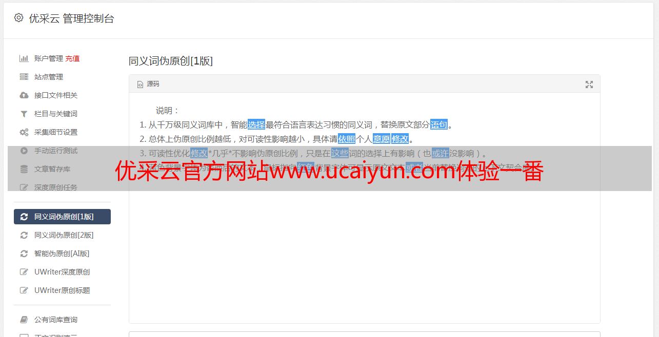 总之,优采云是一款功能强大、易于使用的英文伪原创工具。它能够帮助用户快速生成标题、关键词、图片、视频、语法检测、新闻及时发布等内容,从而有效地提升SEO效果。如果你想要尝试一下这款好用的SEO工具,不妨前往优采云官方网站 www.ucaiyun.com 体验一番吧。