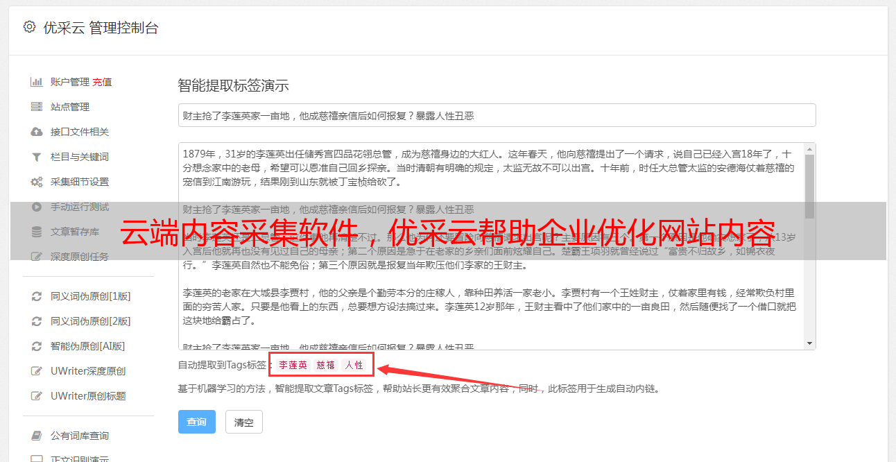 作为一款专业的云端内容采集软件,优采云在功能上具有很大的优势。首先,它可以实时抓取各种信息来源中的有用内容;其次,它不仅能够将数据封装成多种格式,还能针对SEO优化进行特别设计;此外,优采云还具有易上手、易使用、快速部署和成本低廉的特性。无论是大型企业还是中小型企业都可以使用优采云快速、方便地实现信息采集。