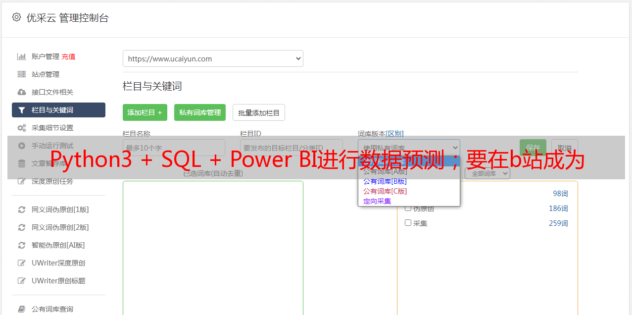 优采云 发布时间: 2020-08-07 18:04主题摘要数据采集: 使用Python3从站点b采集经验值. 数据变化. 数据存储: 将数据存储在mysql数据库中. 数据分析: 使用Power BI连接到数据库以分析数据. 建议初步准备Python3环境和代码调试工具. 建议使用vscode. 长期运行的硬件环境: Synology / Computer / Raspberry Pi以安装和运行mysql数据库,您可以参考以下文章: 在Raspberry Pi上配置MariaDB数据采集并直接放置Python代码,只需修改代码的注释部分. <//p