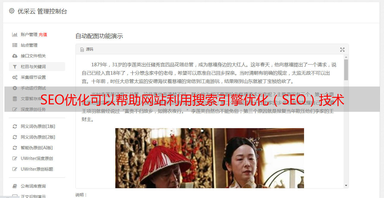 优采云拥有多种功能,其中最受欢迎的是SEO优化功能。SEO优化可以帮助网站利用搜索引擎优化(SEO)技术来实现良好的搜索引擎排名和流量来源。它可以帮助网站在搜索引擎中得到高的曝光度,保证网站的页面内容和关键字相关性,吸引更多的流量。