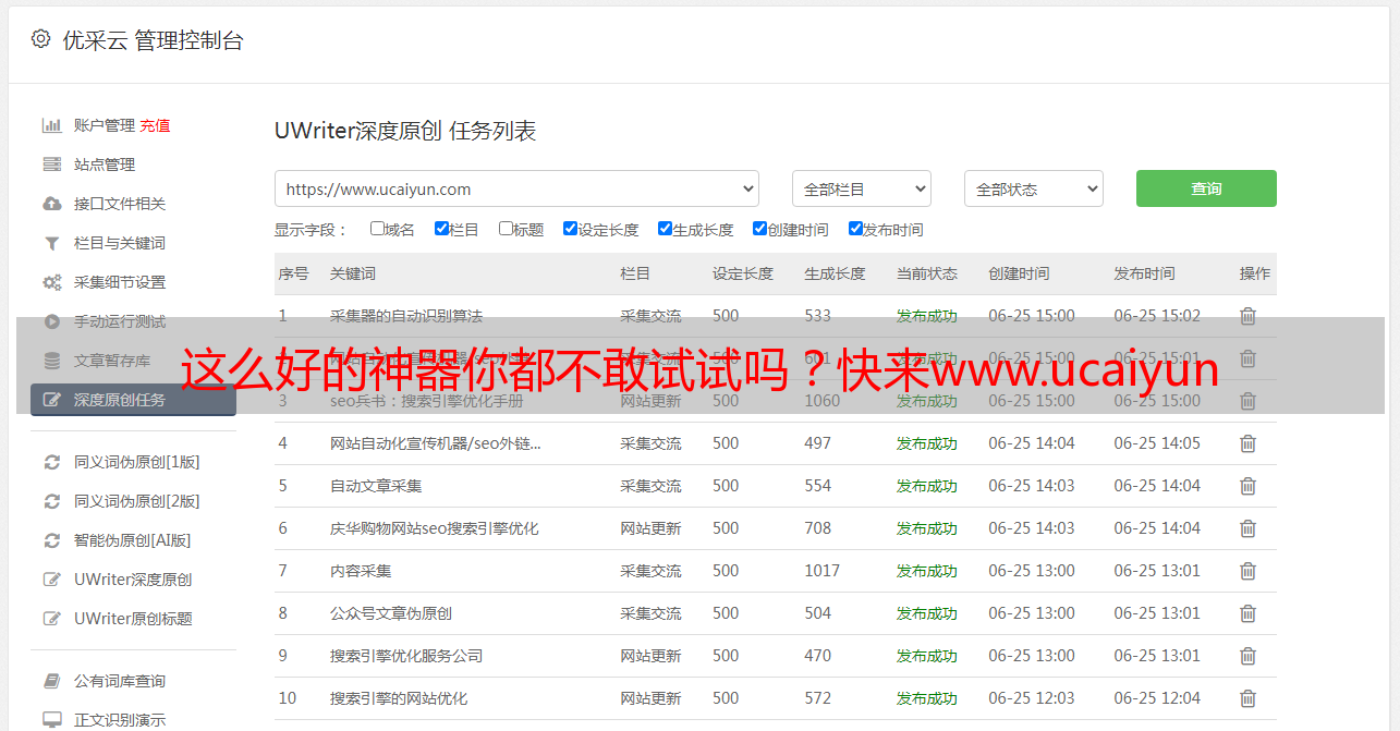总之,优采云SEO优化是一个功能强大、性能卓越的伪原创生成工具。它不仅能够帮助用户快速生成高质量的内容,而且还可以对内容进行SEO 优化、各平台合作和数据导出等功能。如果你想要快速生成高质量文章,那么就试试使用优采云SEO 优化吧!它将为你带来惊喜!这么好的神器你都不敢试试吗?快来www.ucaiyun.com 体验一下吧!