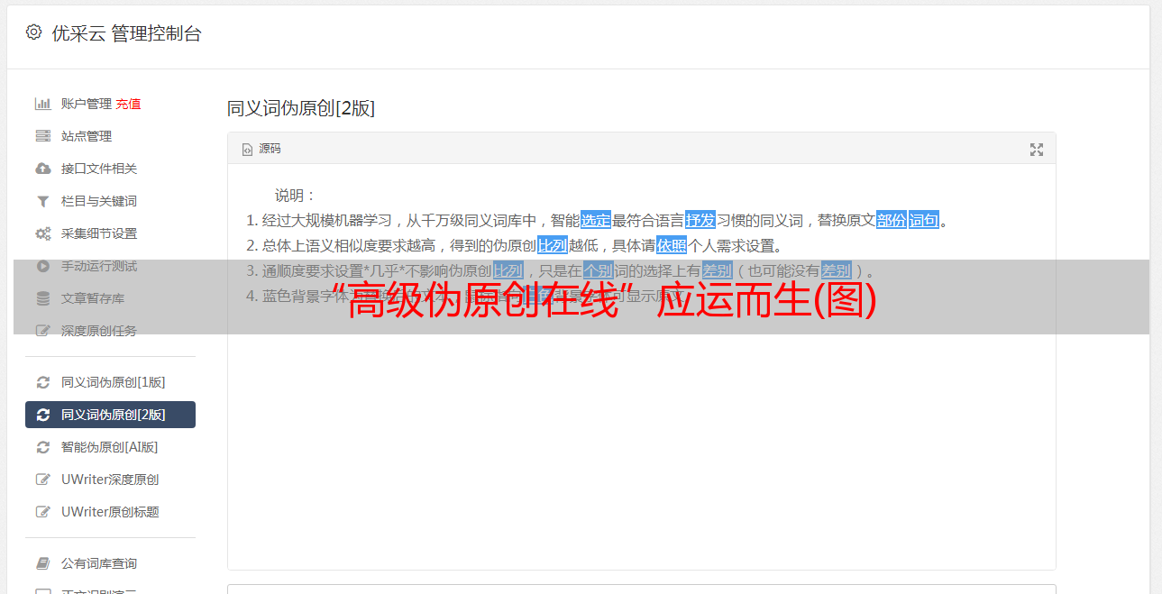 “高级伪原创在线”是由杭州优采云信息技术*敏*感*词*开发的一款SEO优化软件。它通过语义分析、关键词分析、人工智能和其他新兴技术,帮助企业快速实现SEO优化。此外,它还可以帮助用户快速生成原创文章,并将其上传到各大门户站点、新闻媒体、博客平台、微信公众号和QQ空间,实现内容多样化。