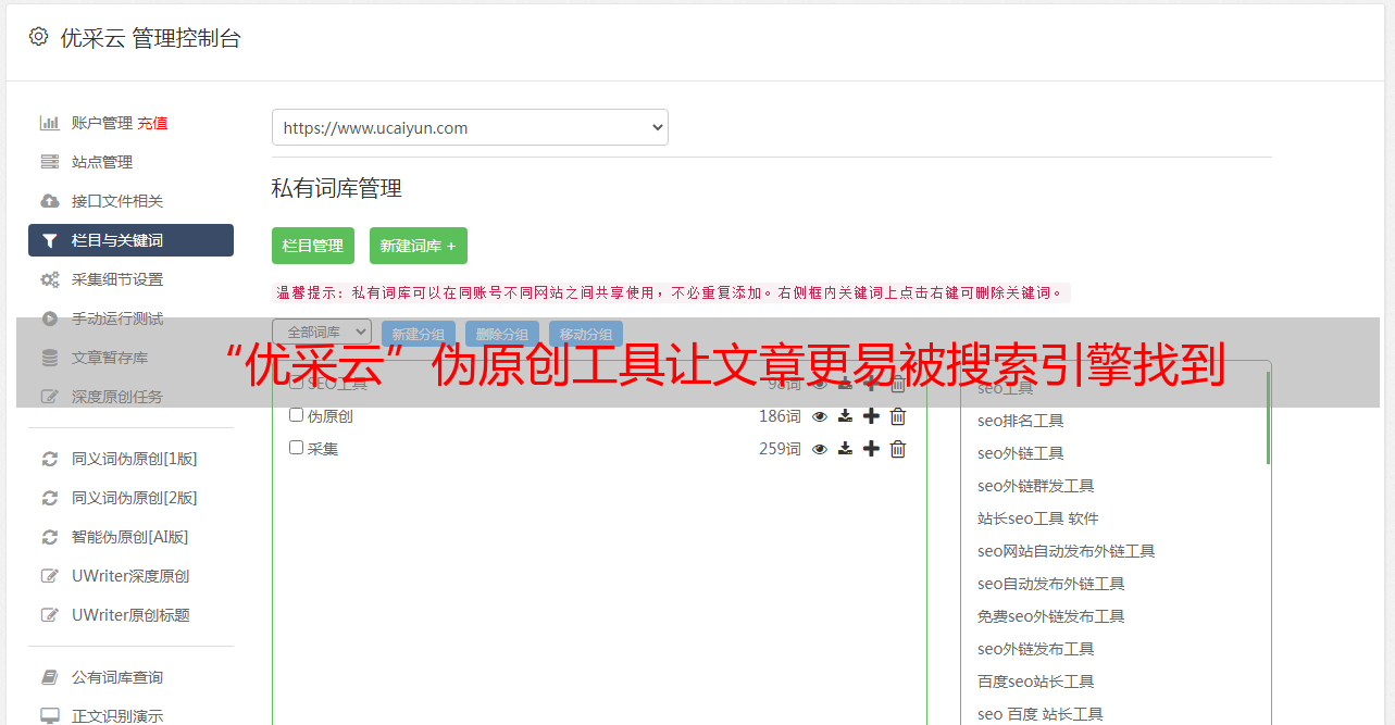 总之,“优采云”是一款非常强大而且易用的伪原创工具,不仅可以快速生成高质量内容,而且还能快速实现SEO优化效果。如果你想要尝试一番“优采云”这款神奇的工具,不妨访问它的官网www.ucaiyun.com 来体验一下吧。