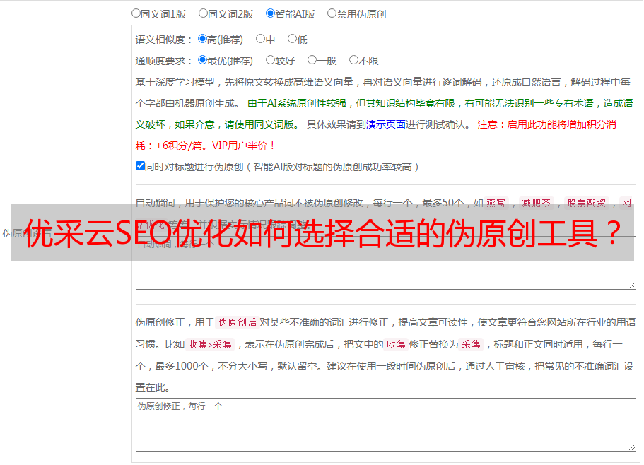 优采云 发布时间: 2023-01-23 08:46伪原创工具是一款可以帮助网站优化的软件,它能够将文章变得与众不同,从而提高文章的搜索引擎排名。由于现在的网络信息量大,文章的原创性也越来越重要,因此伪原创工具的使用越来越普遍。这种工具有很多种,如何选择一个合适的呢?