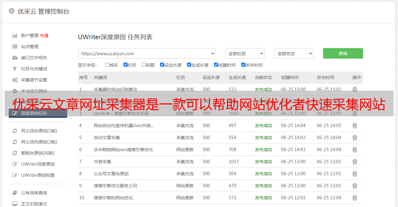 总之,优采云文章网址采集器是一款强大、易用、高效的SEO优化工具。如果你想要快速、准确地采集各种文章网址并提升SEO效果,不妨试试优采云吧!它的官网是www.ucaiyun.com ,你也可以在它的客户端上尝试使用它。