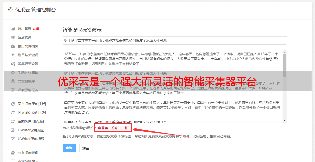 优采云是一款专业的智能采集器,它既可以用于采集数据库,也可以用于采集网页内容、新闻、图片、视频及其它多媒体文件。优采云具有强大的功能,如解决多种不同格式的数据采集、SEO优化、数据分析、文本解析等,可大大降低用户的工作强度,同时还能够根据用户的要求自动执行数据采集任务。