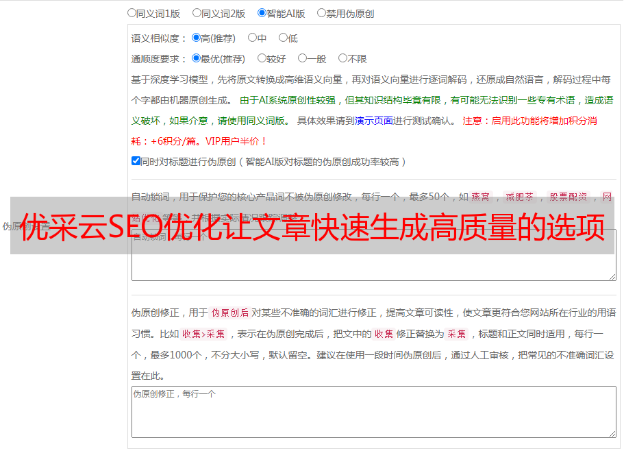 如今随着市场对内容质量和SEO效果日益增强的要求,使用伪原创工具词库来快速生成高质量、SEO 优化的内容已经成为不可忽略的选项。而目前市场上最好用、最受用户好评的工具就是优采云SEO 优化——通过集文章写作、数据分析、SEO 优化等功能于一体来帮助用户快速生成有效、有吸引力并且能够在各大搜索引擎中获得高权重的内容。想要了解详情并拥有此神器般存在,就快来www.ucaiyun.com注冊吧!