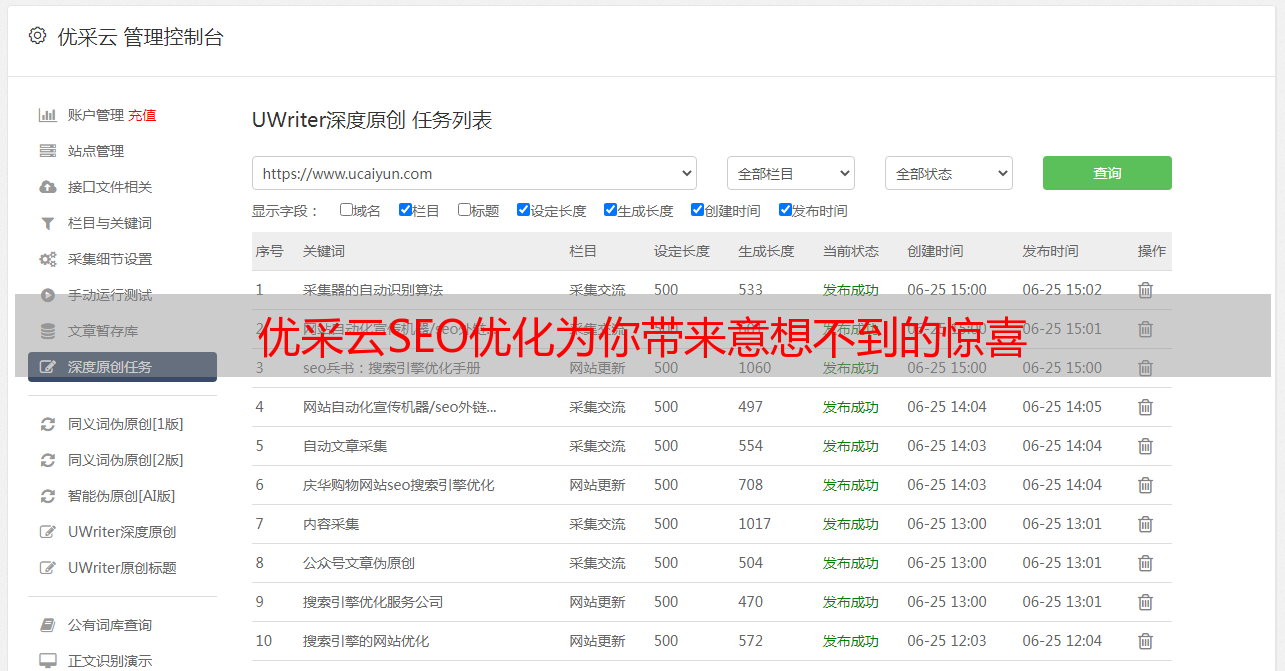 总之,优采云SEO优化是一款强大的原创文章生成工具,它能够帮助用户快速生成高质量、符合SEO标准的原创文章。如果你正在寻找一款好用、高效、方便使用的原创文章生成工具,不妨试试优采云SEO优化。它将为你带来意想不到的惊喜。你可以通过它官网www.ucaiyun.com 了解详情。