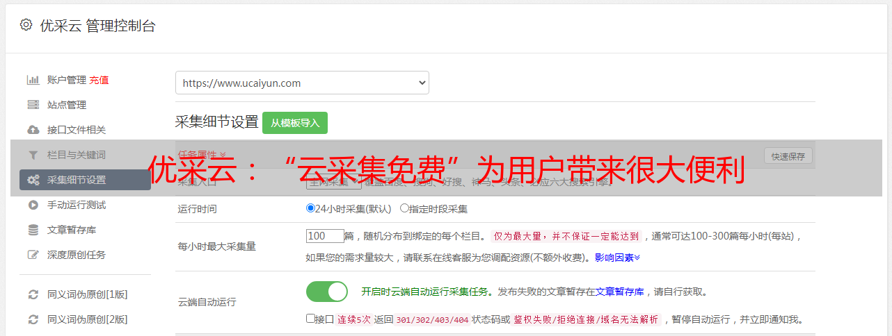 总之,“云采集免费”是一个非常好的SEO优化工具,能够有效地帮助用户快速准确地采集、分析、传递海量信息。如想要详细了解此工具的使用方法、特性及应用场景,请前往优采云官网www.ucaiyun.com进行详细了解。