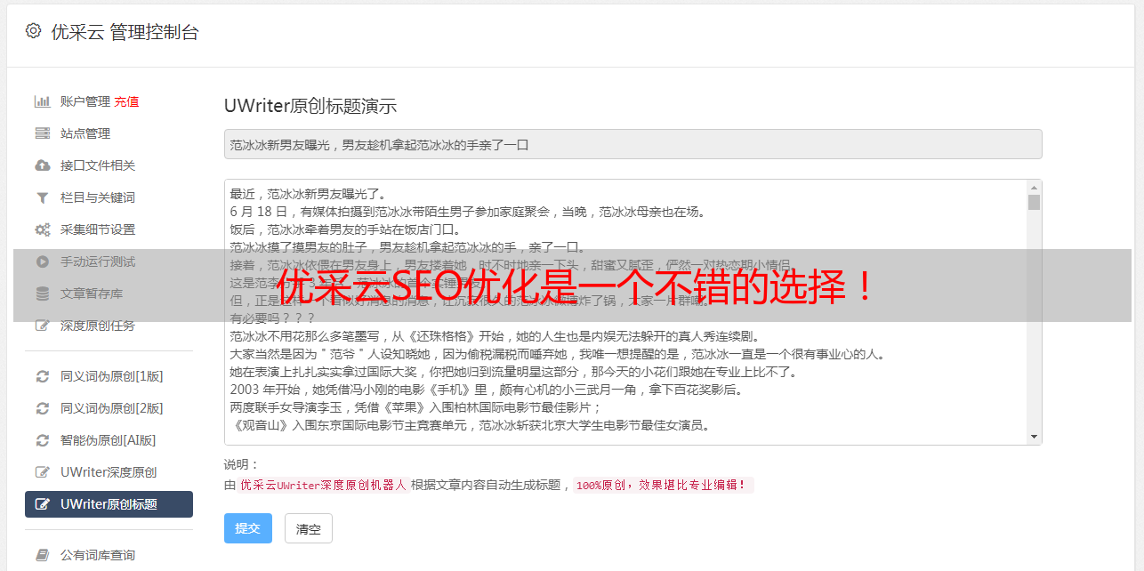 因此,如果你想要快速准确地采集新闻、博客和其它内容时,优采云 SEO 优化是一个不错的选择。它不但可以帮助你快速准确地采集内容,而且还可以对内容进行 SEO 优化!