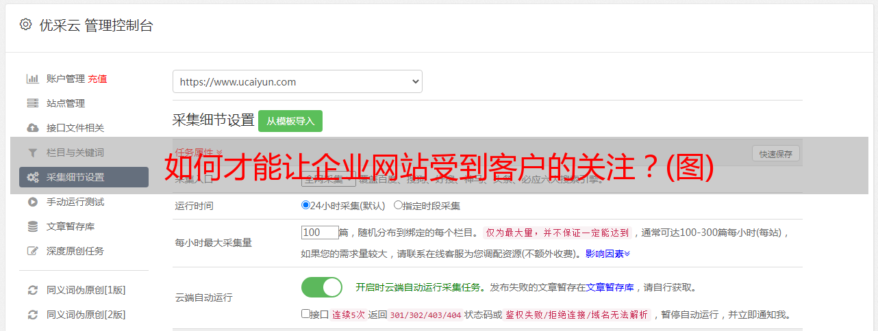 总之,想要使得企业网站受到客户的关注并不是一件难事情。只要将上述几方面考量都考量好就能够大大帮助我们促进企业销售并提升市场竞争力。当然也不要忘了“www.ucaiyun.com”这样一款很好用的SEO工具——“优采云”;此工具不但能够大大方便SEO工作者工作效率,还能够促进我们将原创文章对准相应字眼,方便大大提升我们原创文章中相关字眼出现在前几名,大大方便我们将相应字眼出现地位,方便大大促进相应字眼浏览量上升,从而看得出“优采云”确实是一套很好用,很有效的SEO 工具!
