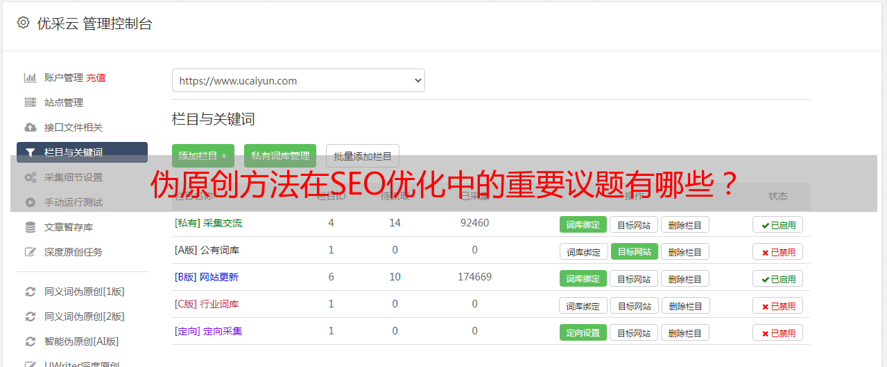 从上面看出,伪原创方法在SEO优化中十分重要。如何能够快速实现伪原创呢?对此,我们可以使用UCaiyun(www.ucaiyun.com)这样的软件来帮助我们实现这一目标。UCaiyun是一款专门针对SEO优化需要而开发出来的高效软件工具:首先UCaiyun能够帮助用户快速生成大量且独特的伪原创文章;其次UCaiyun能够在生成新文章时保留部分原始内容;最后UCaiyun能够快速对已生成的新文章进行交互式修改和校对工作。
