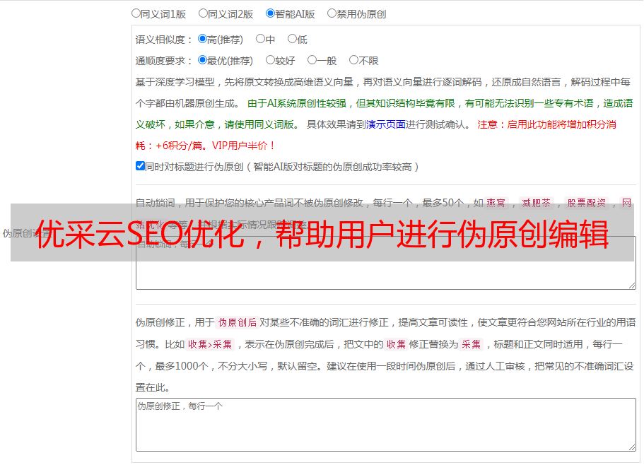 优采云SEO优化就是一款能够帮助用户进行伪原创编辑的软件。它可以将文章中的关键词进行重新组合,使文章看起来更有条理、有逻辑性。而且它还可以帮助用户增加文章的字数,使文章看起来更充实、有说服力。另外,它还可以帮助用户将文章中的词语进行重新整合,使得文章看起来更加通顺。