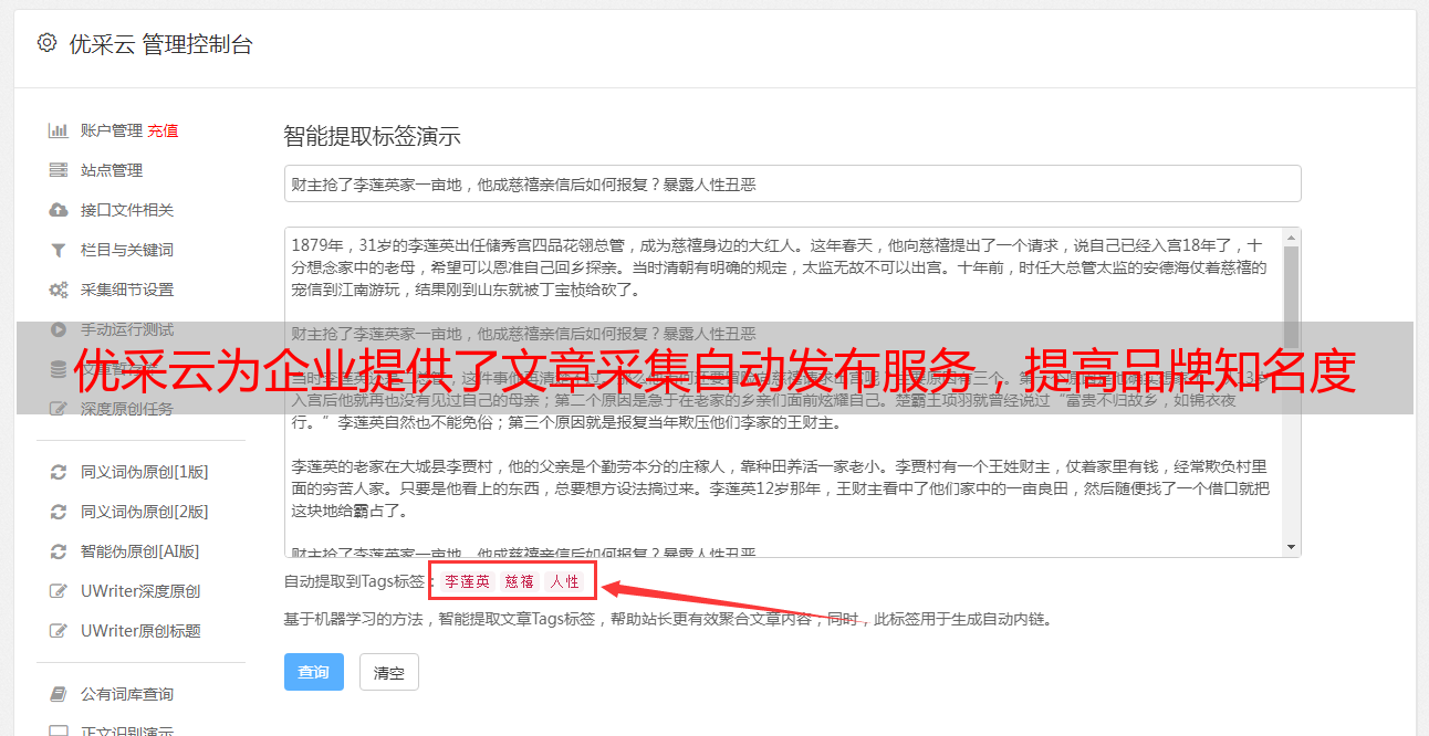 优采云为企业提供了文章采集自动发布服务,提高品牌知名度