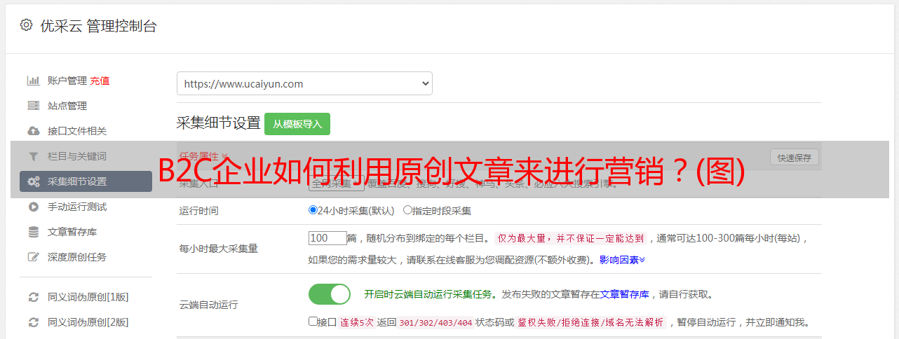 此外,还要注意SEO优化。SEO(Search Engine Optimization)是搜索引擎优化的简称,是一门将文章排名排到前几位的技术。SEO能够帮助原创文章被更多人看到。考虑到这一点,优采云就推出了一套SEO优化服务,可以帮助企业快速实现SEO优化。使用这套服务可以大大降低SEO学习和实施成本,帮助企业快速提升原创文章的关键词排名。官方网站www.ucaiyun.com上也有相关介绍,可供大家参考。