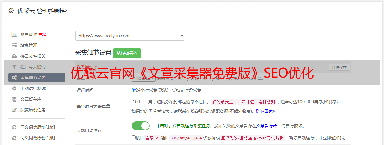 总之,《文章采集器免费版》是一款专业而高效的新闻内容生产工具,能够帮助用户快速准确地从互联网上采集内容并生成SEO优化后的内容。不仅如此,该工具还能够将生成的内容保存到本地电脑中供大家浏览使用;并且将内容上传到优釅云官网www.ucaiyun.com上供大家浏览和下载使用。