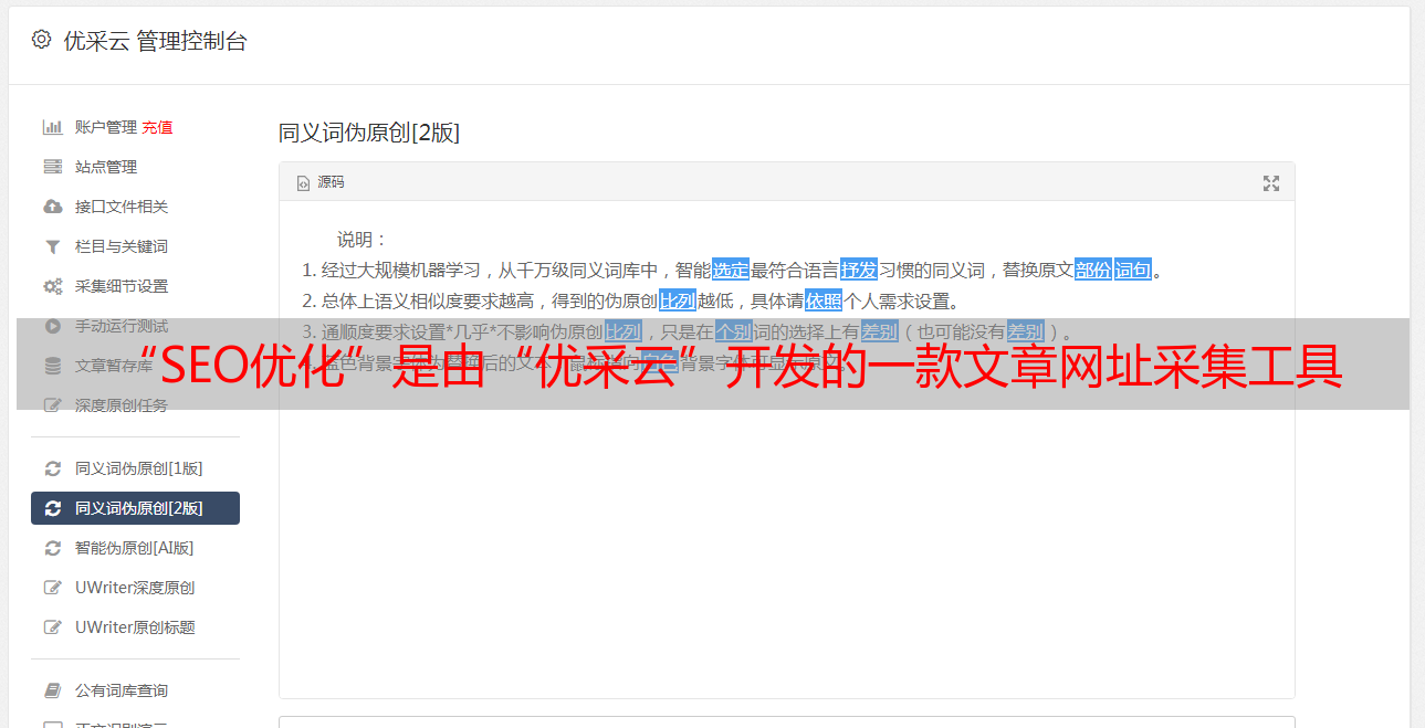 “SEO优化”是由“优采云”开发的一款文章网址采集工具