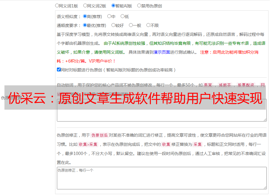 总之,优采云是一款卓越而出色的原创文章生成软件。它既能够帮助用户快速生成高质量原创文章,又能够帮助用户快速实现SEO优化目标。如果你想要尝试使用这款原创文章生成工具来帮助你快速写出高水准原创文章,不妨前往优采云官网www.ucaiyun.com来体验一番吧!
