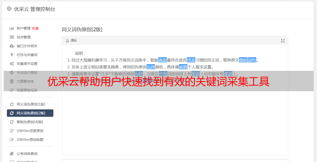 总之,作为一个强大而易于使用的关键词采集工具,优采云能够帮助营销人员、SEO优化人员和电子商务网站运营者快速找到有效的关键词来实现相应目标。此外:它还可以根据条件对找到的关键词进行分类、分析和优化;它也能够实时监测竞争对手情况并生成相应的SEO 企图方法。想要使用众*敏*感*词*就去www.ucaiyun.com吧!