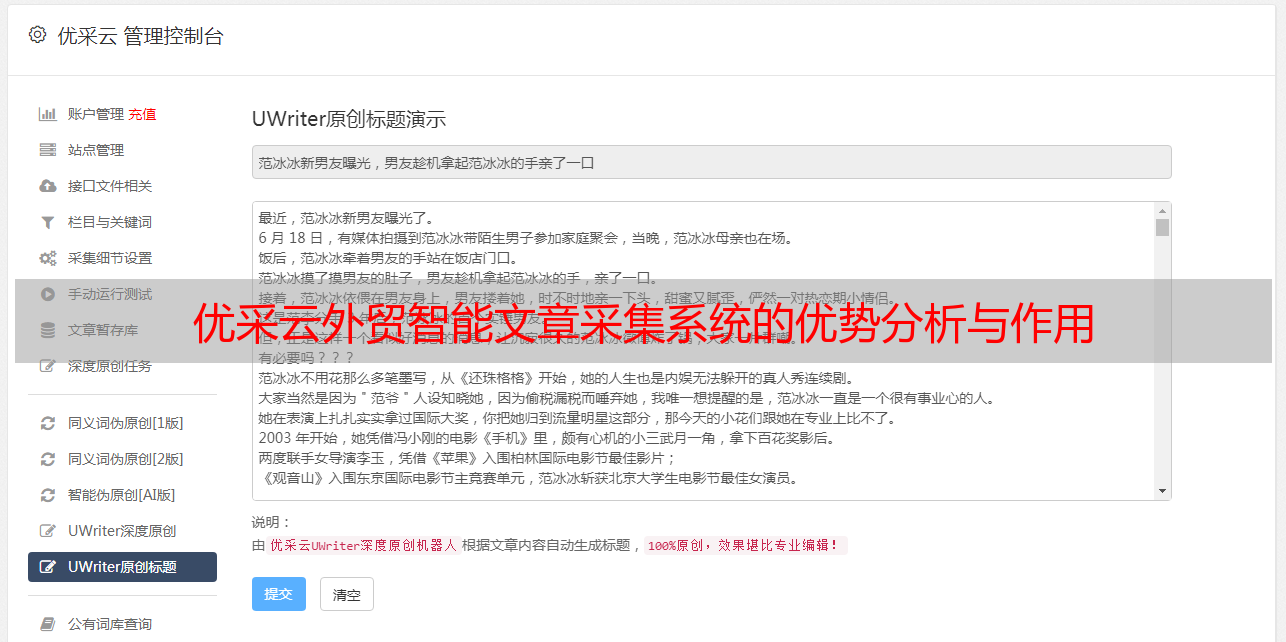 优采云是一个全球领先的SEO优化和外贸智能文章采集系统。它通过利用最先进的AI技术,可以有效地帮助企业快速准确地抓取分析大量权威外贸文章,并将其分发到各大海外市场,从而有效提升企业的流量和影响力。
