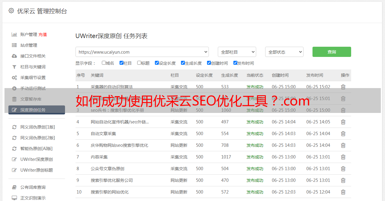 总之,想要成功使用优采云SEO优化工具并不难——明确目标、利用好各项功能、利用好“伪原创”功能即可。如果你也想要尝试一下这样的SEO优化工具,不妨前往www.ucaiyun.com进行下载试用吧~