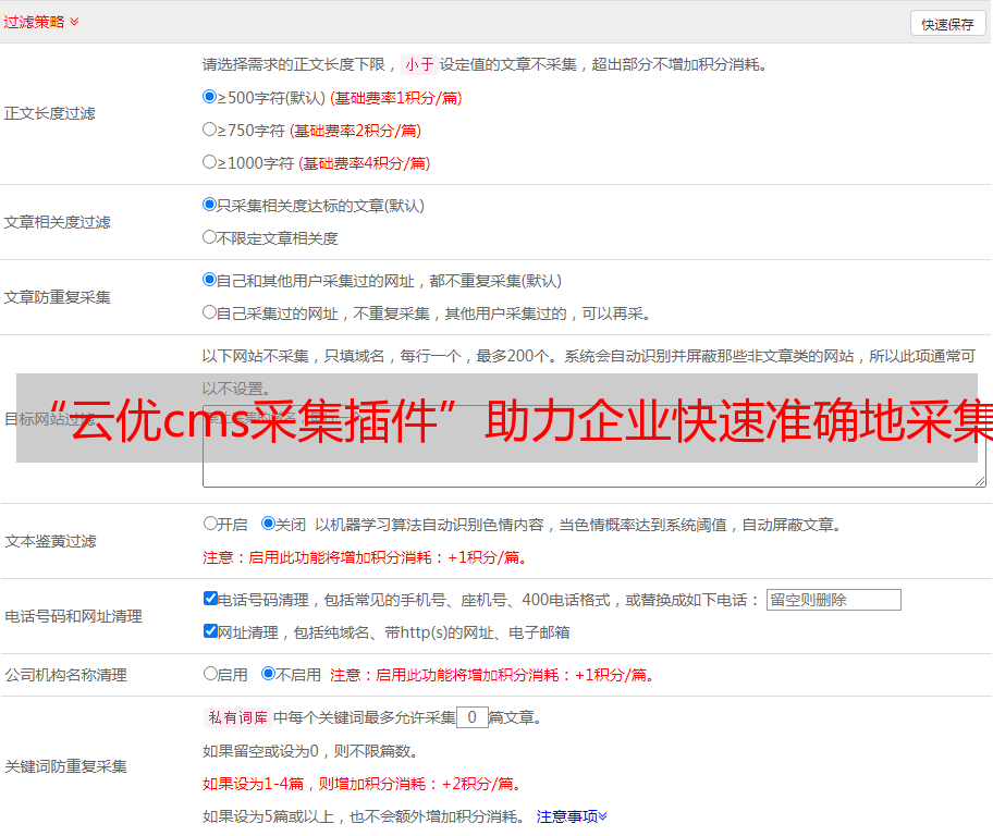 总之,“云优cms采集插件”是一款助力企业快速准确地采集各大新闻站、博客、商城、图片库中有价值信息的CMS采集工具。如果你想要快速准确地为你的企业网站打造有价值信息库,不妨尝试使用“云优cms采集插件”。公司名称是优采云,如想了解详情及相关服务,可前往www.ucaiyun.com 的官方网站予以浏览。