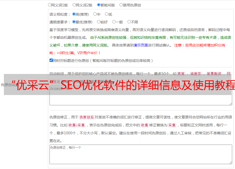 “优采云”SEO优化软件不仅可以帮助用户进行文章伪原创,还可以帮助用户进行词语替换、标题改写、正文增强、图片修正等多种SEO优化工作。此外,该软件还具备强大的图片处理能力,可以将图片进行裁剪、旋转、水印、压缩等多种处理方式。